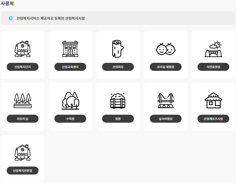 산림복지서비스 제공자로 등록된 산림복지시설에서 사용가능합니다. 산림복지바우처 사용처는 홈페이지에서 지역별로 검색이 가능하니 확인 후 사용하시면 됩니다.