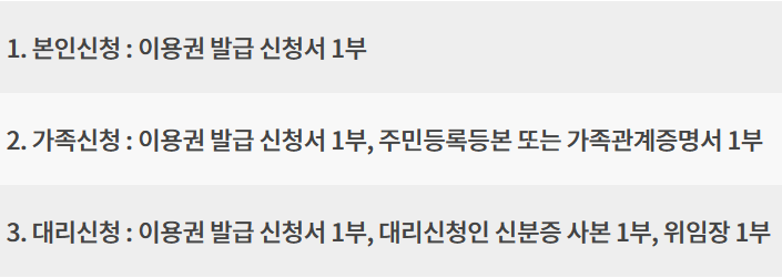 3. 대리신청 시 이용권 발급 신청서 1부, 대리신청인 신분증 사본 1부, 위임장 1부