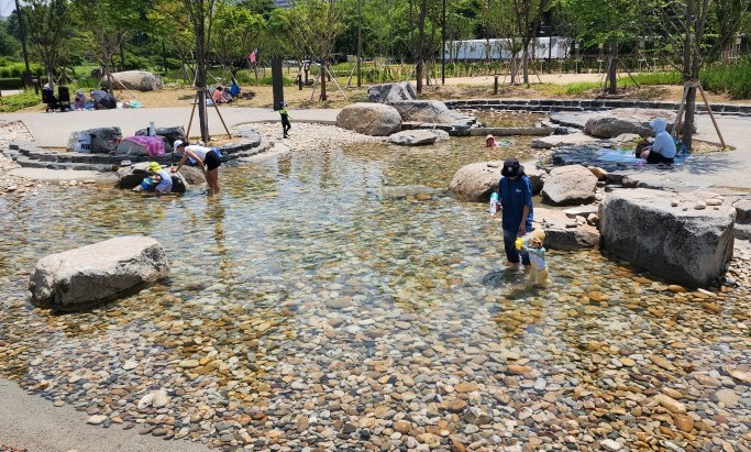 기존의 노후화된 잠실수영장을 사계절 이용할 수 있는 '자연형 물놀이장'으로 재조성하여 인위적이지 않은 자연 소재를 활용했고, 전체 면적의 50% 공간에 나무 18종, 초화류 식재가 있다고 합니다.