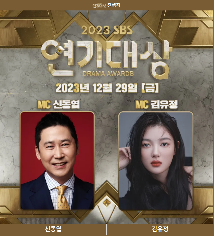 SBS 연기대상은 다른 방송사 연기대상 시상식 중 가장 먼저 열리는 시상식입니다. 신동엽 님은 2017년부터 7년 연속 SBS 연기대상 진행을 맡으면서 최다 연속 진행자라는 타이틀을 갖게 되었고, 김유정 님은 3년 연속 신동엽 님과 함께 SBS 연기대상 MC 맡으면서 둘만의 호흡을 기대하고 있습니다.