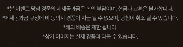✔️제세공과금 규정에 비 동의시 경품이 지급 될 수 없으며, 당첨이 취소 될 수 있습니다.