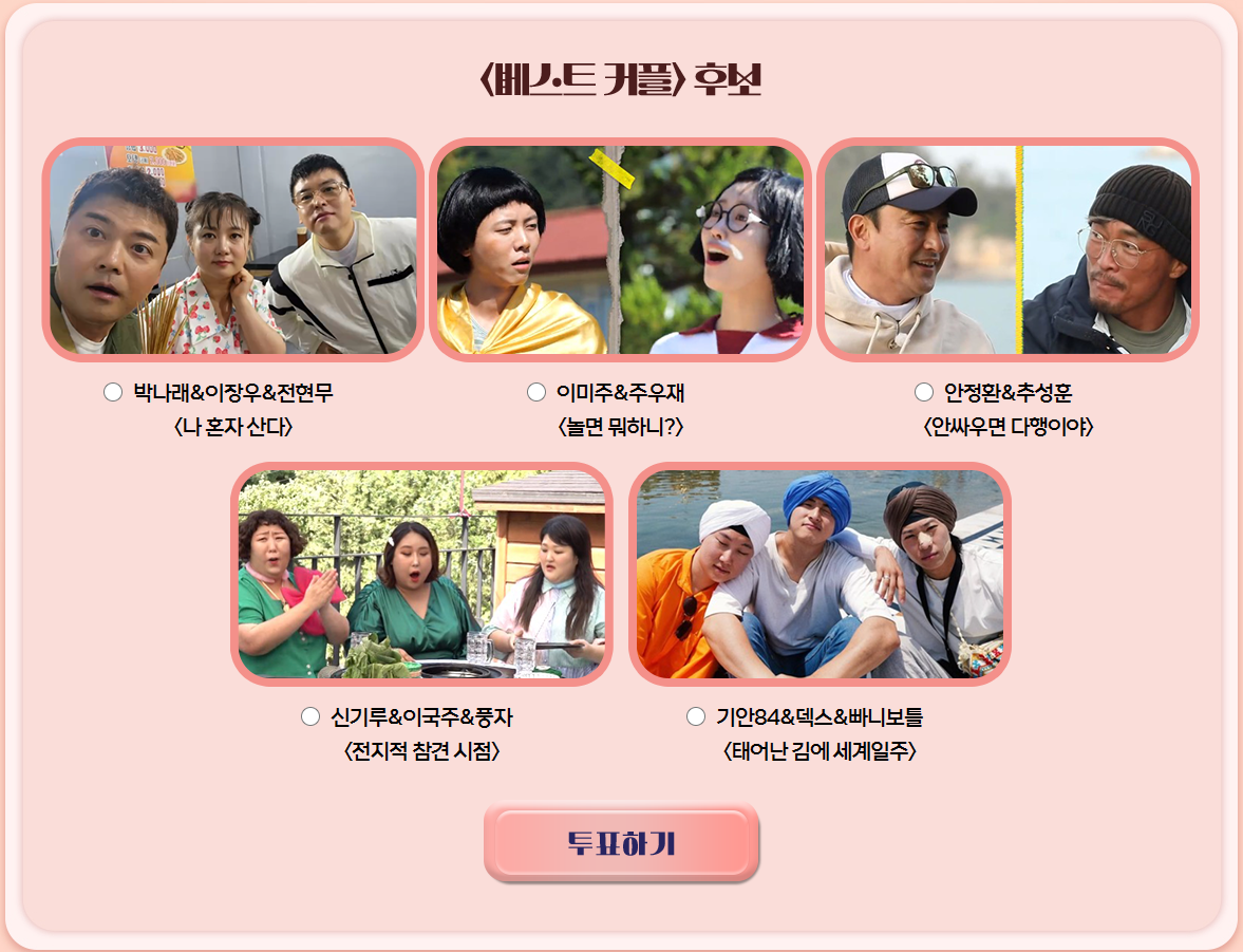 후보는 5커플로 박나래&이장우&전현무<나 혼자 산다>, 이미주&주우재<놀면 뭐하니>>, 안정환&추성훈<안싸우면 다행이야>, 신기루&이국주&풍자<전지적 참견 시점>, 기안84&덱스&빠니보틀<태어난 김에 세계일주> 입니다.